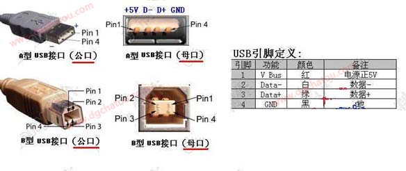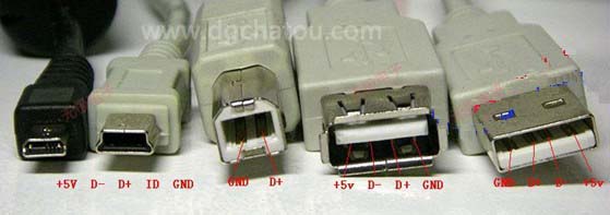 從左往右依次為:miniUSB公口(A型插頭)、miniUSB公口(B型插頭)、USB公口(B型)、USB母口(A型插座)、USB公口(A型插頭)