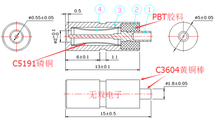 材質:外管、中心針:C3604黃銅棒;彈圈:C5191磷青銅;膠料:PBT膠料