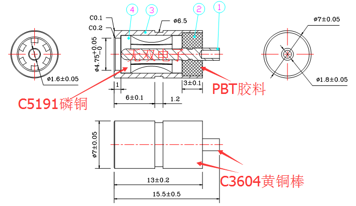 材 質:外管及中心針式:C3604快削黃銅棒,彈圈:C5191磷青銅,膠料:PBT+15%Pb