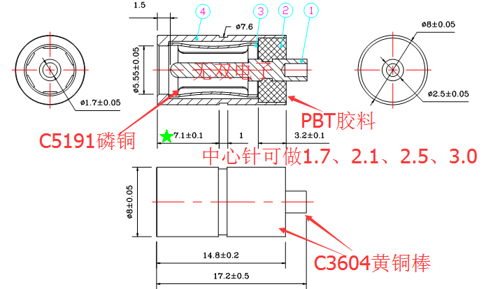 材 質:外管及中心針式:C3604快削黃銅棒,彈圈:C5191磷青銅,膠料:PBT+15%Pb