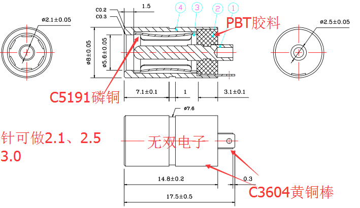 材 質:外管及中心針式:C3604快削黃銅棒,彈圈:C5191磷青銅,膠料:PBT+15%Pb