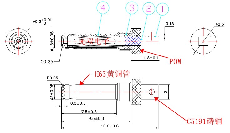 材 質:外管:H65黃銅帶,端子及負極焊片:C5191磷青銅,膠料:臺灣寶理POM料