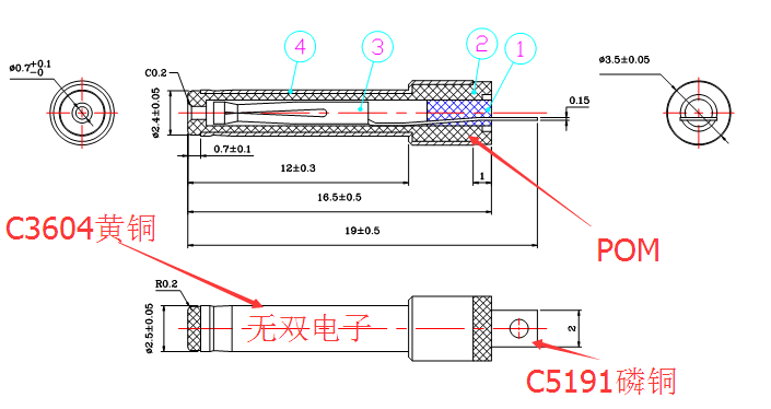 材 質:外管:C3604黃銅棒,端子:C5191磷青銅,膠料:臺灣寶理POM料