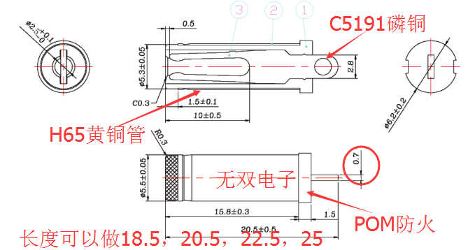 材 質:外管:H65黃銅管,端子:C5191磷青銅,膠料:PBT防火膠料