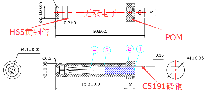材 質(zhì):外管:H65黃銅管,端子:C5191磷青銅,膠料:臺灣寶理POM料
