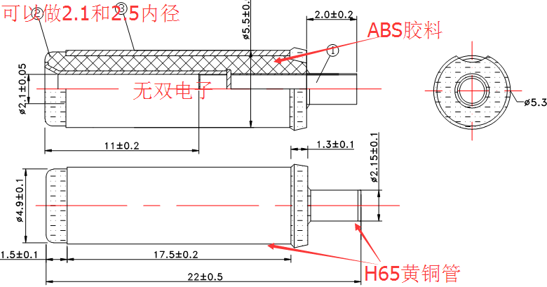 產品描述:OD=5.0mm,ID=2.1/2.5mm,L=22.5mm;黑膠及其它顏色,鍍層為鍍鎳或鍍金.