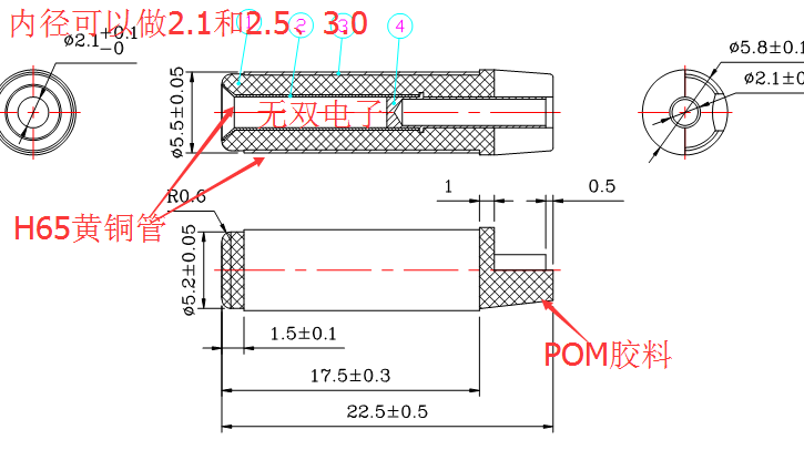 產品描述:OD=5.5mm,ID=2.1/2.5mm,L=22.5mm;黑膠及其它顏色,鍍層為鍍鎳或鍍金.