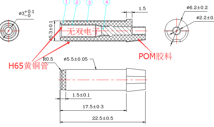 產品描述:OD=5.5mm,ID=3.0mm,L=22.5mm;黑膠及其它顏色,鍍層為鍍鎳或鍍金.