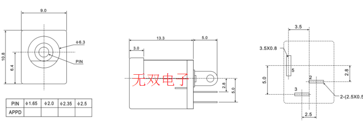 產品描述:內徑6.3,針大小1.6/2.0/2.5,可以對插5.5*1.65,5.5*2.1,5.5*2.5公頭