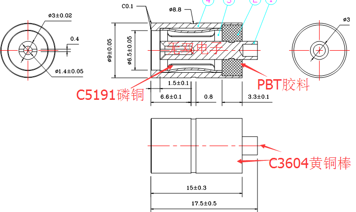 材 質(zhì):外管,中心針:C3604快削黃銅棒,彈片:C5191磷銅,膠料:PBT+15%Pb