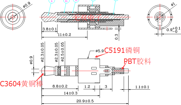 產(chǎn)品描述:2.5*21.0五極5.9盤加銅圈插針,黑膠/白膠及其它顏色,鍍層為鎳或金.