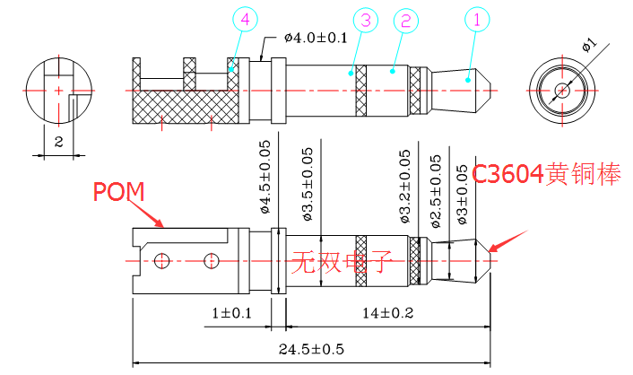 產品描述:3.5*4.5*24.5立體聲插針,黑膠/白膠及其它顏色,鍍層為鎳或金.