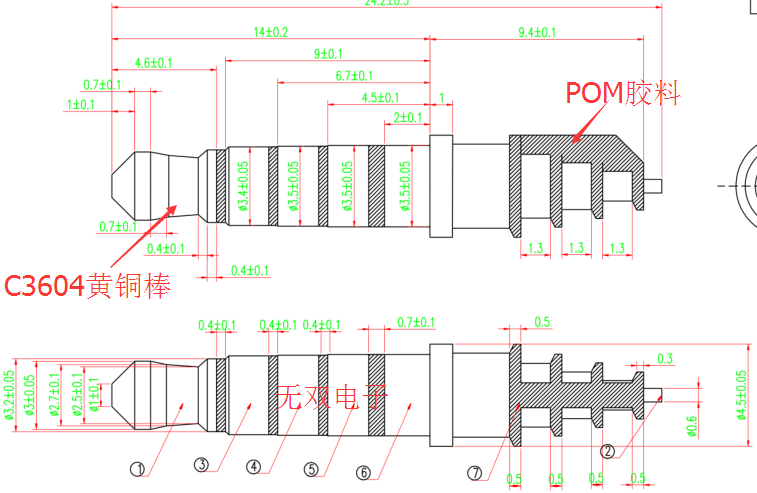 材 質:一段和四段C3604黃銅,二,三段H65黃銅,膠料:臺灣寶理POM環保料