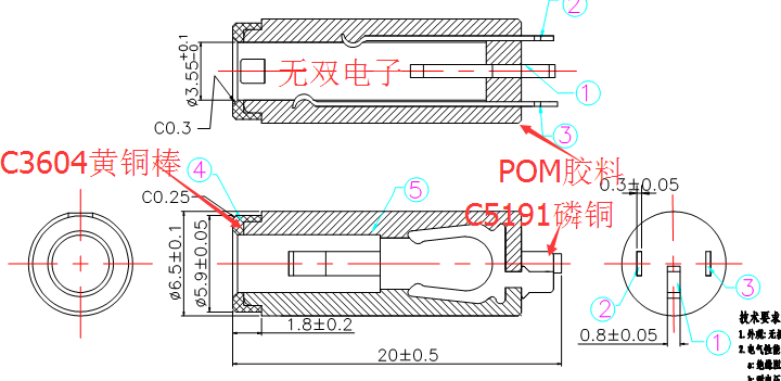 產品描述:3.5*5.9*20.5三極耳機母座,鍍層為鎳或金.