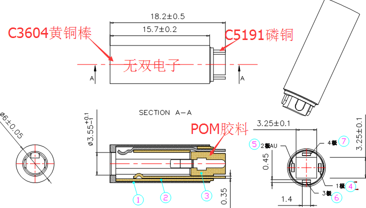 產品描述:3.5*6.0*18.2三極耳機母座,鍍層為鎳或金.