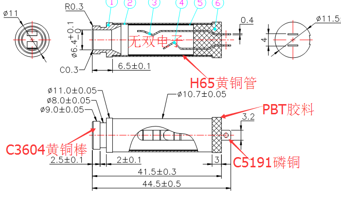 材 質:前端:C3604黃銅棒,外管:H65黃銅,彈片:C5191磷銅,膠料:PBT環保料